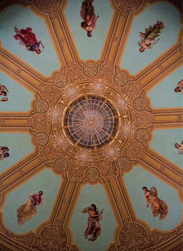 В частности, вдохновением для формы и цветовой гаммы часов послужил плафон «Аполлон и музы», расположенный на потолке зрительного зала и поражающий своей красотой.