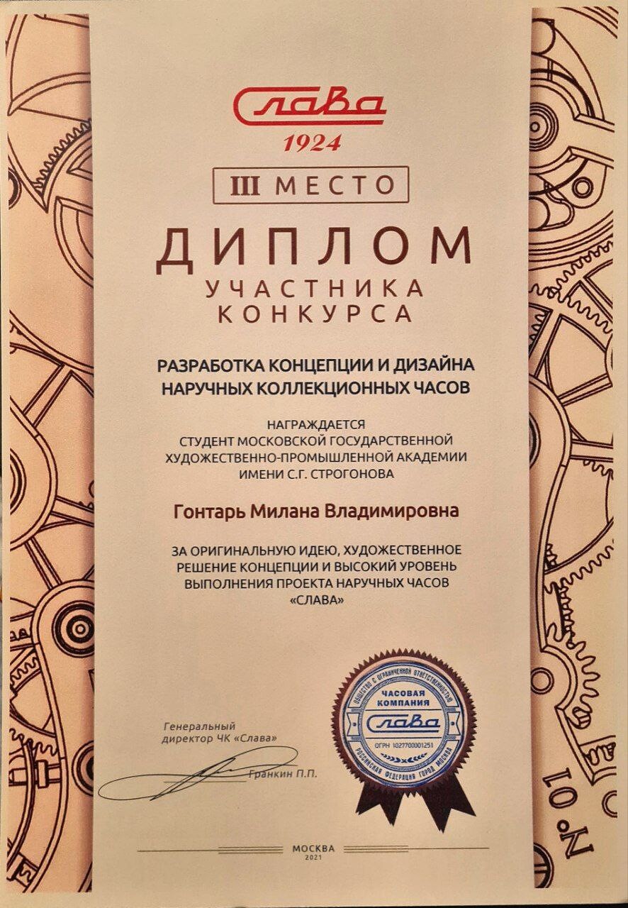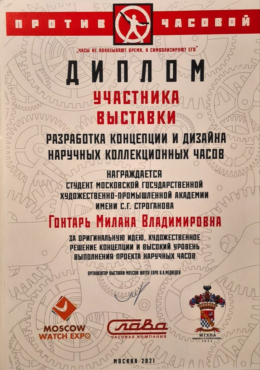 Проект занял третье место в конкурсе от часового завода «Слава» и участвовал в выставке «Moscow Watch Expo».