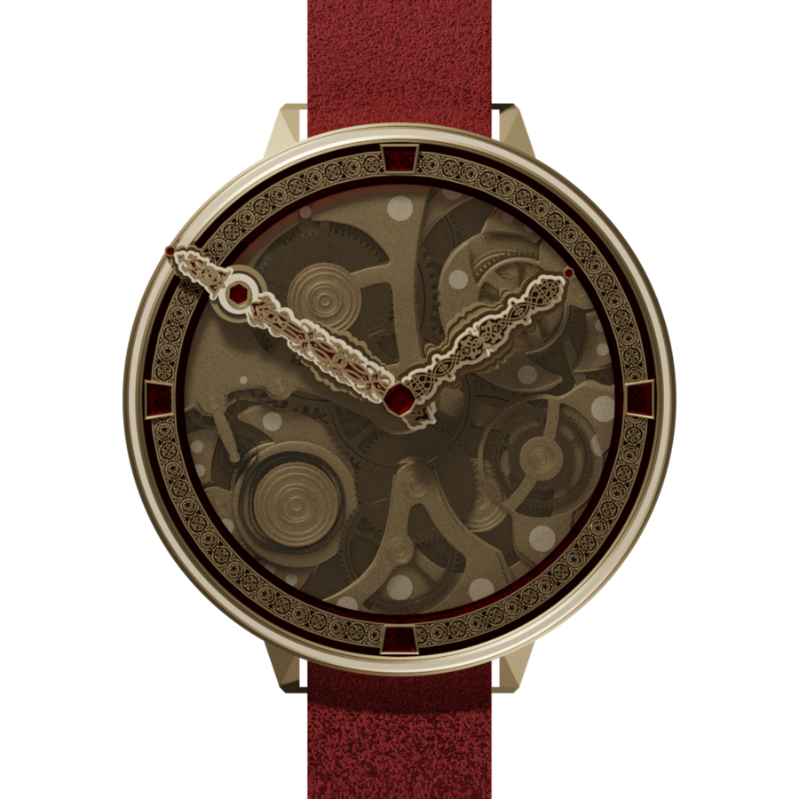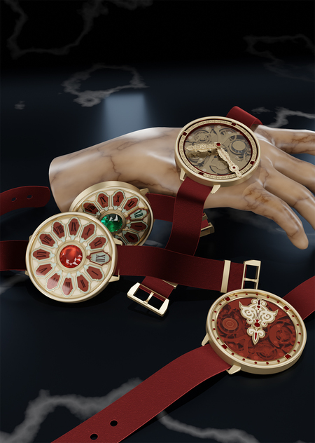 Для наручных часов не случайно выбрана нестандартная конструкция, подчёркивающая образ величественности, монументальности, возвышения над суетой. Практически на всех этих часах, представляющих из себя полноценное ювелирное украшение, отсутствуют минутные и секундные стрелки, на циферблате можно увидеть только час.