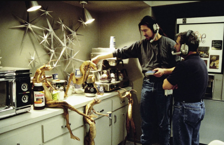 Черви изначально должны были быть крупнее и появиться в другой сцене. Аарон Симс вылепил миниатюрные макеты инопланетян ростом около девяти футов, а механик Юрген Хайманн сделал с них слепки из вспененного полистирола и снял короткую сцену в импровизированной кофейне. Идея понравилась Барри Зонненфельду, и её включили в фильм. Рик Бейкер добавил, что Симс сделал коллаж из кукол — одни «пили кофе», другие «курили» — и Барри решил, что в фильме будет четверо таких червей.