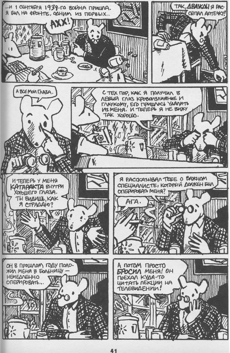 Арт сидит за чертежным столом. Вокруг него роятся жирные, реалистично нарисованные мухи. Взгляд читателя скользит вниз, под чертежный стол, где вместо пола обнаруживается гора истощенных мышиных трупов. Этот визуальный шок — сопоставление банальной фигуры художника, жалующегося на депрессию, и фундамента из тел жертв Холокоста — создает вертикальный диссонанс. Художник буквально «строит» свою карьеру на костях предков. Маска на лице Арта видна с завязками на затылке, что подчеркивает искусственность его попыток понять опыт отца. Трагедия здесь заключается в невозможности истинного свидетельства: сын выжившего может лишь «надеть маску» боли, но не пережить её.