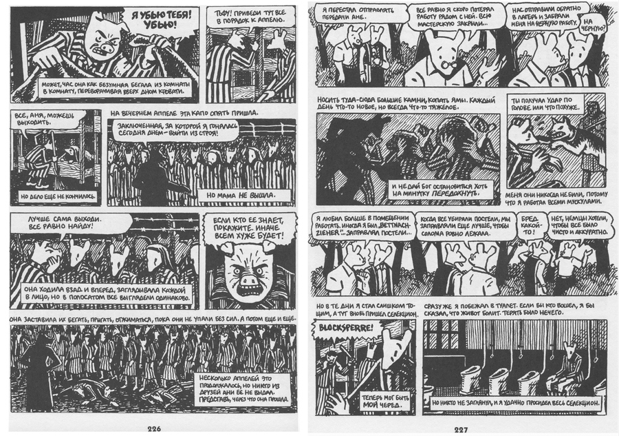 Визуальный стиль Шпигельмана, характеризующийся экспрессионистской тушью и тяжелыми тенями, создает обманчивую простоту. Диссонанс возникает в моменты, когда «мышиная» реальность сталкивается с объектами реального мира или когда метафора начинает разрушаться под тяжестью повествования. Шпигельман использует этот контраст, чтобы показать, что идентичность в лагере смерти стирается до видовой принадлежности, но под маской всегда остается человек.