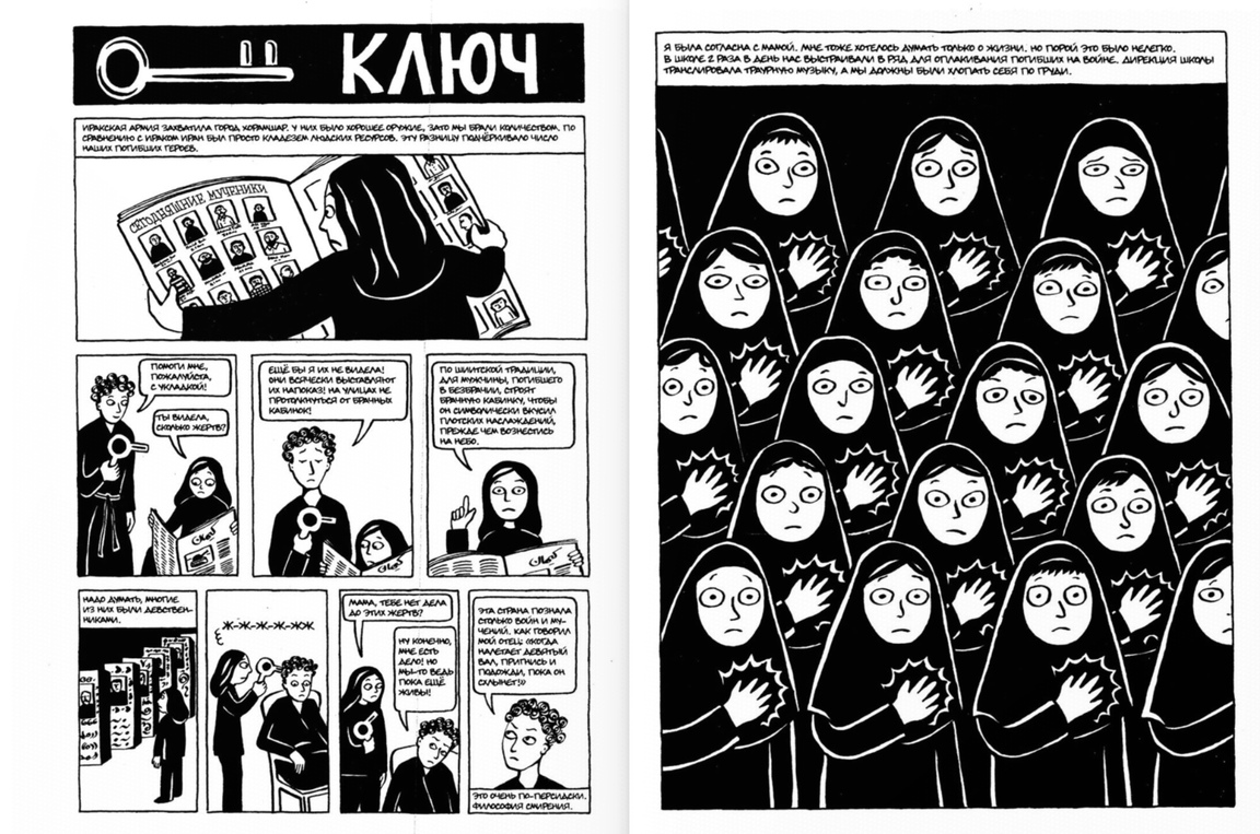 Эта визуальная рифма связывает две реальности, разделенные классом. Богатые дети танцуют на вечеринке, бедные дети «танцуют» на минах. Диссонанс работает на обличение несправедливости: стиль рисунка уравнивает эти события графически, заставляя читателя осознать чудовищную пропасть между их смыслами. Пластиковый ключ становится символом этой лжи — безделушка в обмен на жизнь