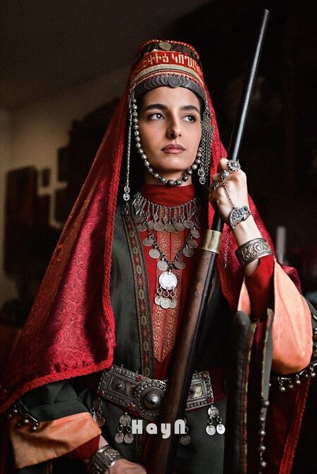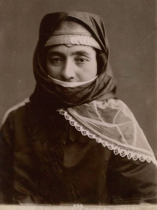 Западные же армянки носили фески без кисточек и один большой прозрачный платок, тогда как восточные армянки носили сразу несколько плотных платков — одним закрывали нос-подбородок, второй обвязывали поверх первого, а третим покрывали всю конструкцию включая поли сверху.