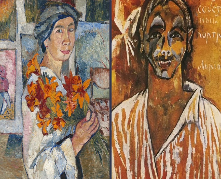 Автопортреты. Наталья Гончарова (1907 г.) и Михаил Ларионов (1910 г.). Фотографии Натальи Гончаровой и Михаила Ларионова.