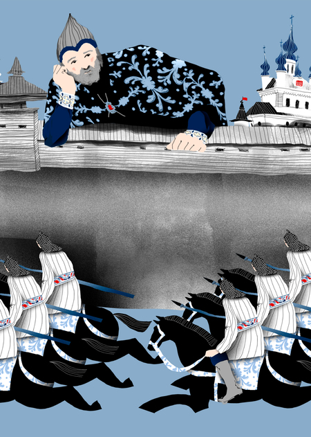 Юрий Долгорукий в городе-крепости наблюдает за набегом соседствующих народов