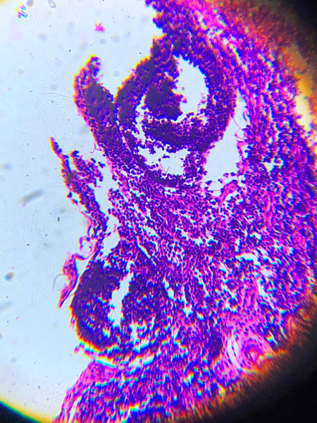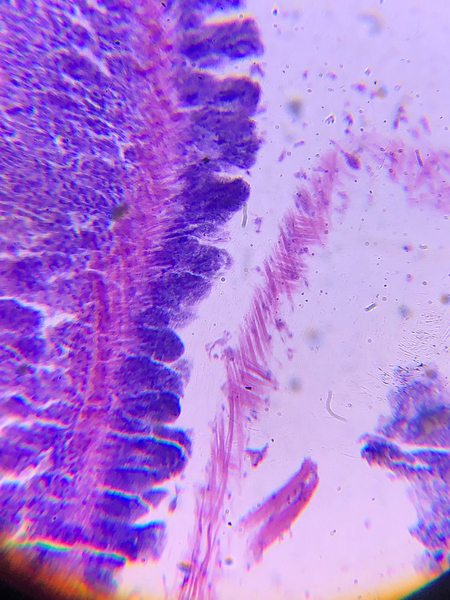 Cor rattus, sectionio longuitudinalis (heart of rats, longitudinal section). Micropreparatom on the optical glass. / Scotch on the pine. Moscow region, zoom lens, compact camera.