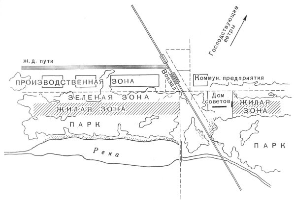 Магнитогорск, СССР, 1930‑е — (изображение не представлено) Черновой план города предполагал вытянутую полосу заводских цехов вдоль реки и жилых кварталов вдоль одной магистрали. Это пример того, как индустриализация определяет город по линейному принципу.