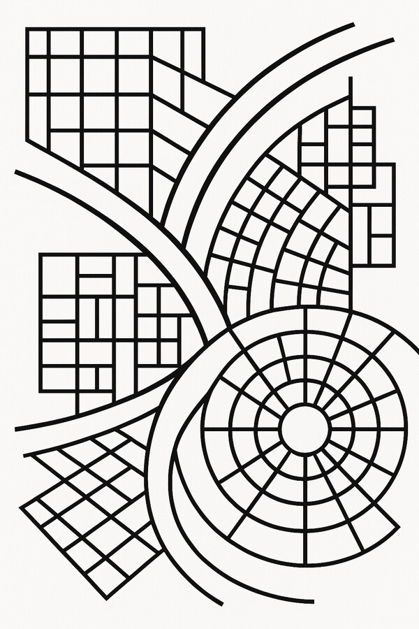 Структура исследования построена вокруг четырёх основных типов геометрии — сетки, центрической схемы, линейной композиции и криволинейных форм. За ними следуют два блока, где конфликт проявляется особенно резко: стыки регулярной и нерегулярной ткани и пересечение двух сеточных систем. Такой порядок позволяет не только описать формы, но и показать, как они сталкиваются в конкретных городах и почему эти столкновения происходят.