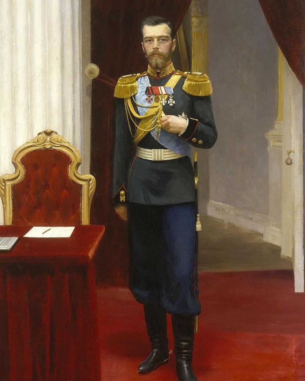 Коронационный портрет Николая II следует классическому канону: мантия, скипетр, трон. Но выражение лица — мягкое, почти застенчивое — не совпадает с величественным антуражем. В парадных портретах в военной форме читается та же двойственность: чёткая выправка, но отсутствие внутренней силы.