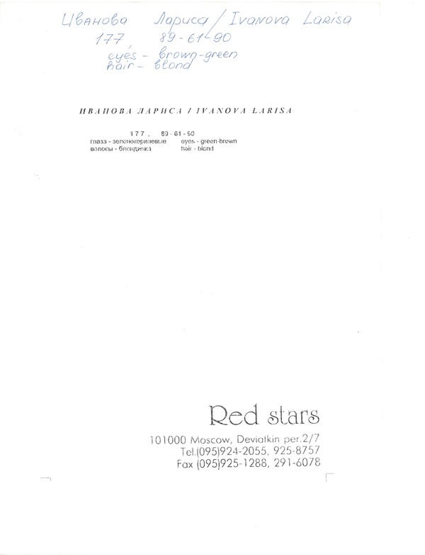 Лариса Иванова — в конце 1990х-начале 2000х одна из самых востребованных моделей Red Stars, съемки с ней украшали страницы всех ключевых российских модных журналов эпохи, в 2001–2006 годах занимала пост генерального директора модельного агентства Red Stars.