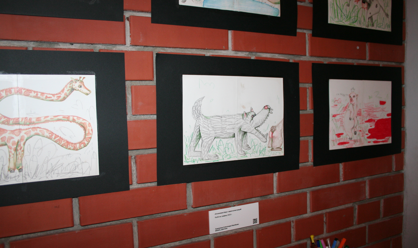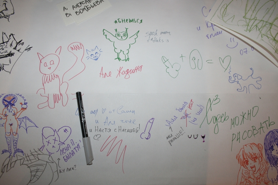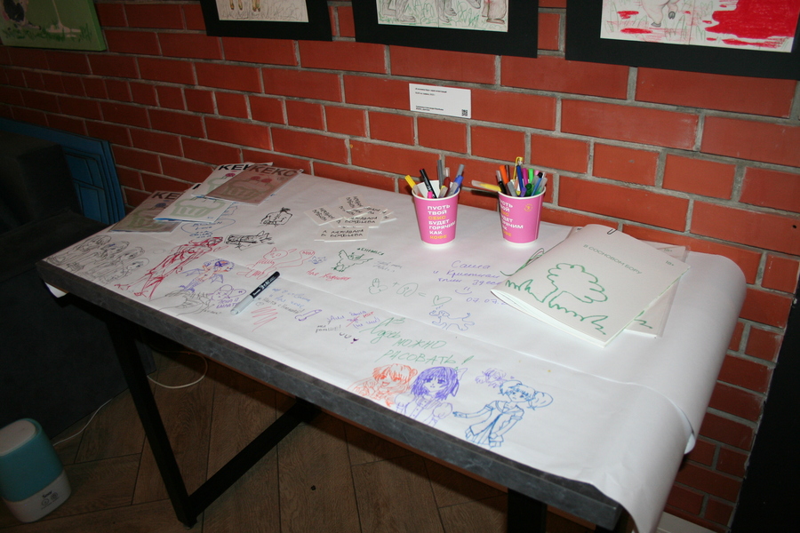 Зрителям было предложено порефлексировать над темой выставки, была создана интерактивная зона с растеленным ватманом и маркерами.