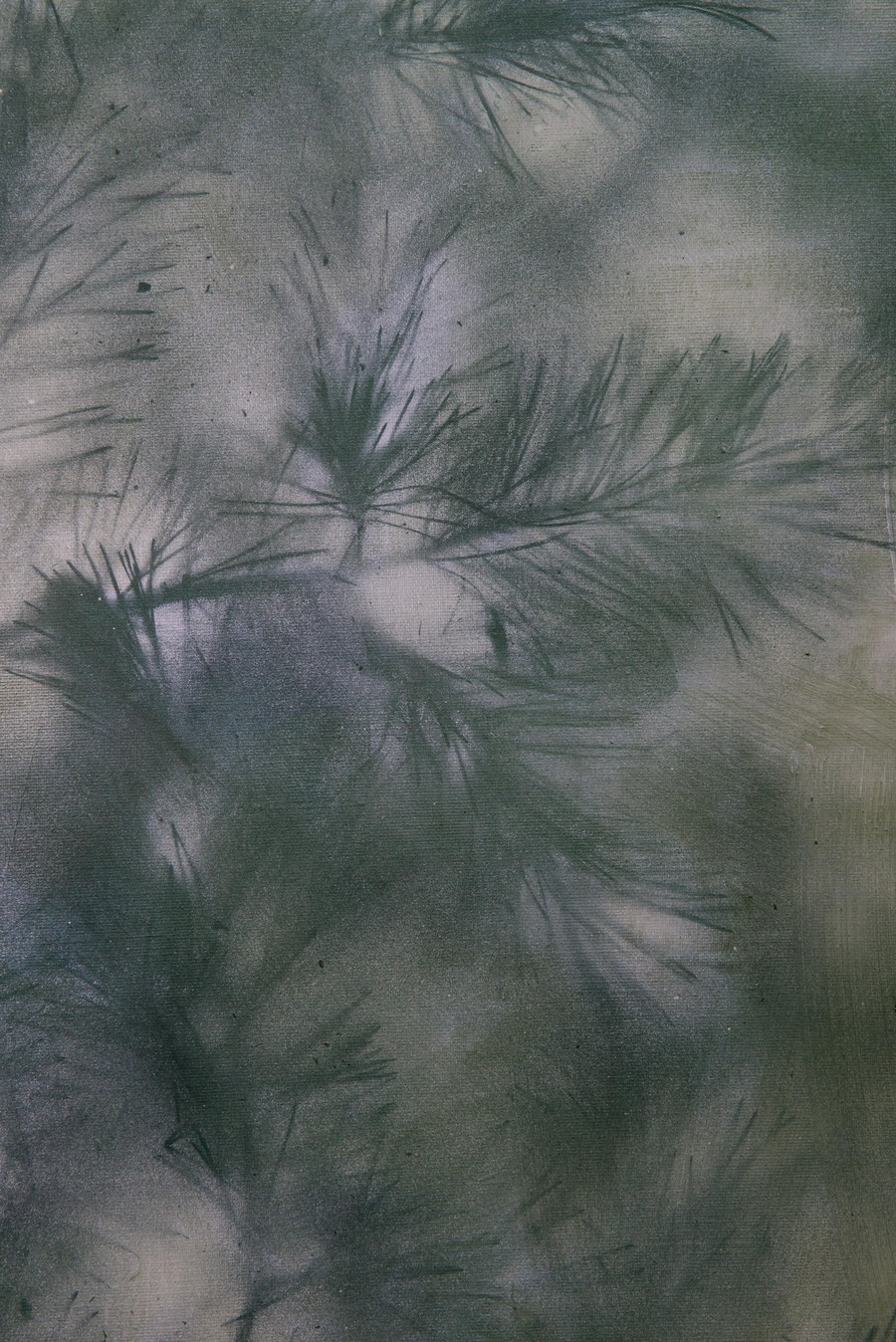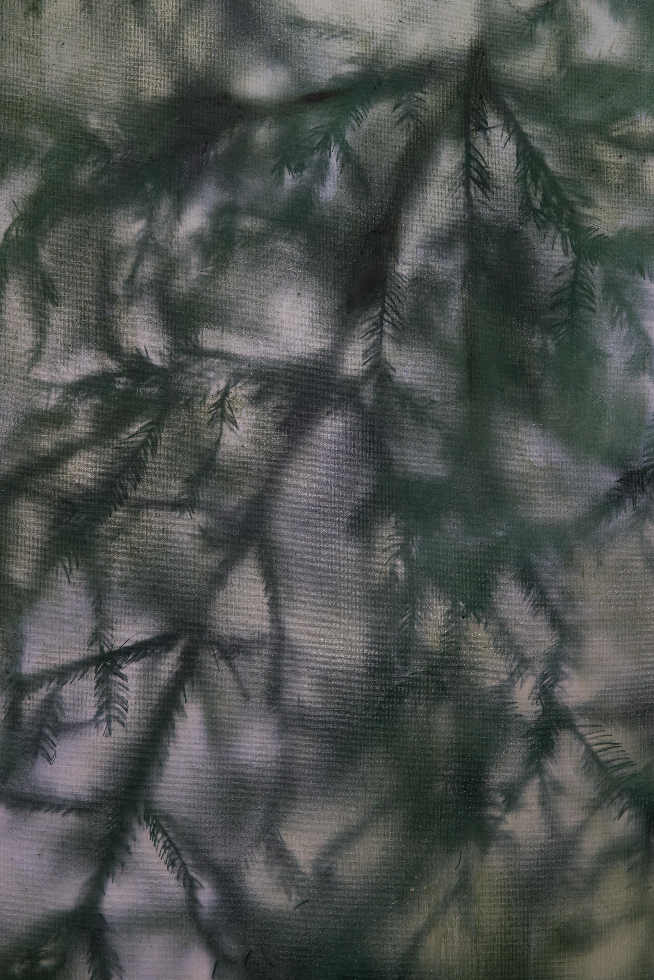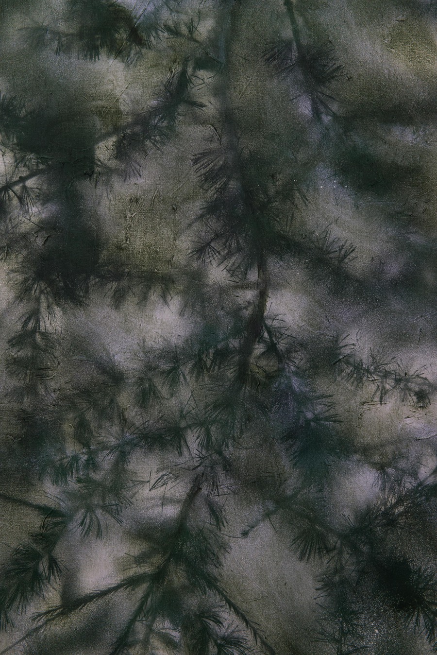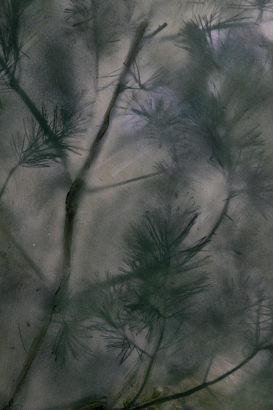 Здесь представлена натурная печать хвойных. Своей объективностью она дополняет живописные изображения этих деревьев, созданные опытом и воображением. Но и там, и там природа заявляет о своем присутствии через материальность — в оттиск ветвей или мазках «земляной» краски.