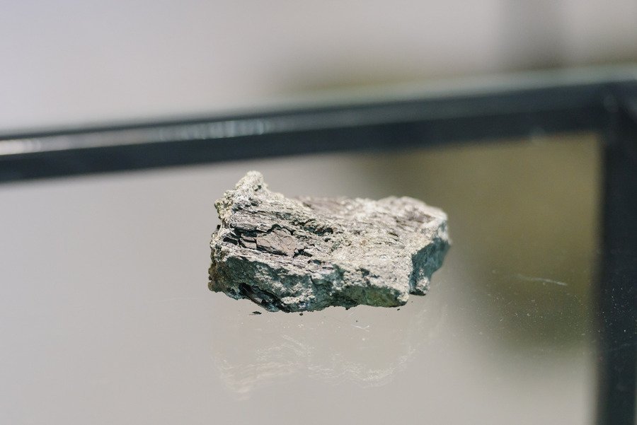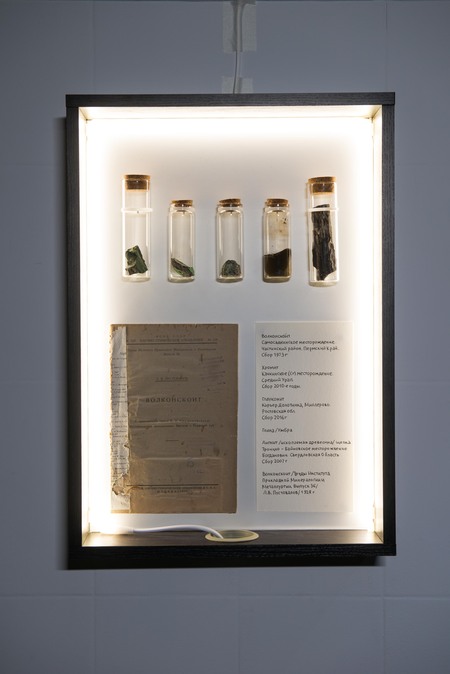 Центральное место в исследовании занимает волконскоит. В интернете мало научной информации о нем. Я работала с дальними фондами хранения Ленинки, так как основные научные публикации об этом минерале относятся к 1920-м годам. Чтобы собрать по крупицам знание, надо было проверить все вторичные отсылки из изданий смежных отраслей. Зачастую приходилось прибегать к помощи сотрудниц, чтобы искать вручную — в цифровом каталоге этих изданий не было. Некоторые ключевые журналы в государственных библиотеках были уже списаны, их я искала на онлайн-барахолках. Два из них представлены на выставке. Там же нашлись и образцы минералов — часто их коллекции вместе с научной литературой распродают наследники советских геологов.