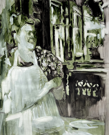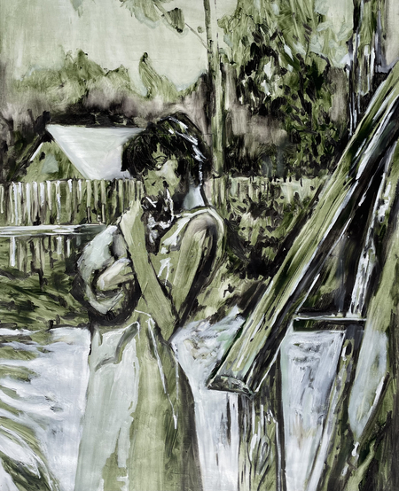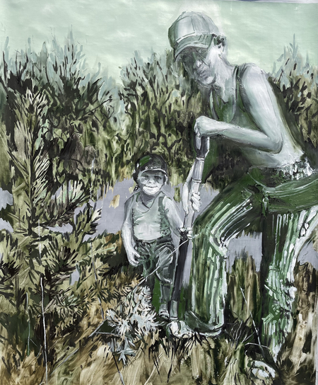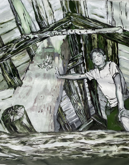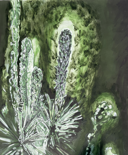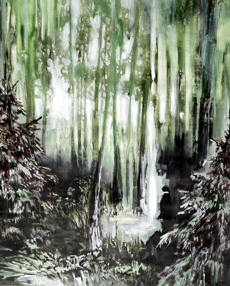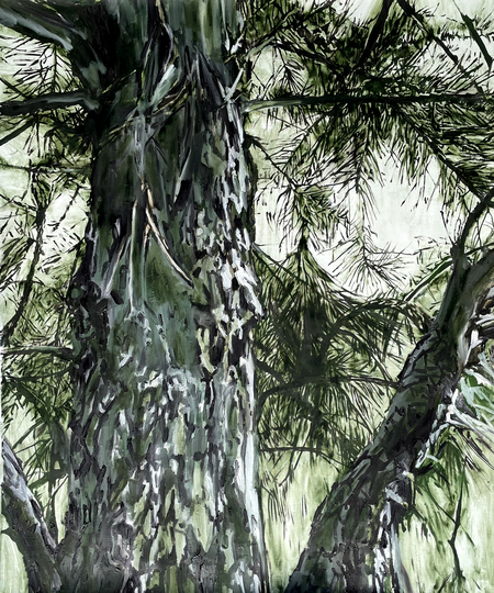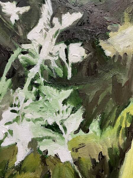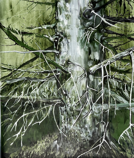 На холсте — «земляные» краски, неорганическая материальность окаменелых деревьев. Она ощутимо заявляет о себе, и эта проявленность подталкивает поразмышлять над медиумом. Поверхность холста похожа на барельеф, сложенный из множества объемных мазков. Этот ландшафт будто скрывает в себе геологические неровности, которые заботливо приняли в себя упавшие древние деревья.