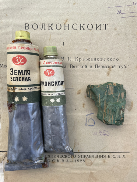 Волконскоит — зеленый глиноподобный минерал, относящийся к пигментной группе «земля зелёная». Встречается только в в одном месте на планете — в Предуралье. Волконскоит открывали дважды и дважды он становился художественным медиумом.