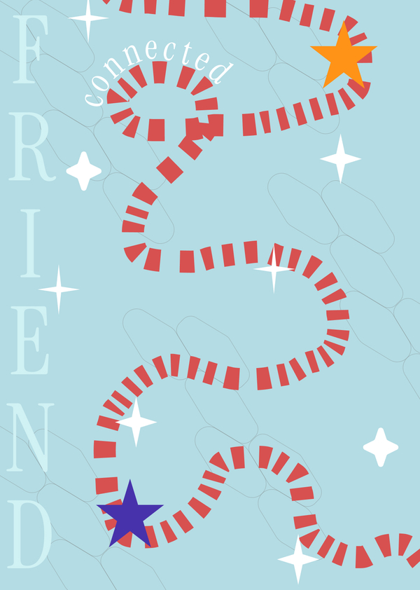 This poster is about true friendship. We can choose friends and that the cause it is so important. Build a friendship is a conscious movement. This poster is about how people choose friends. There are a lots of different people among us but are they our friends? In a crowded room we often look for «that» guys, which is called «friends». And it is what it is. Orange and blue stars could make a friend among their environment but can you notice that they don’t have any similarities? We are like stars. We need a person who will be similar with us and fit well in our lives. These bright stars found each other anf connected. I decide to depict connection by red line. It draws attention to main objects and describes objective of this art. In conclusion I want to say to you, dear beholder, don’t be afraid to try to build a friendship with very different people, maybe you will find that friend.