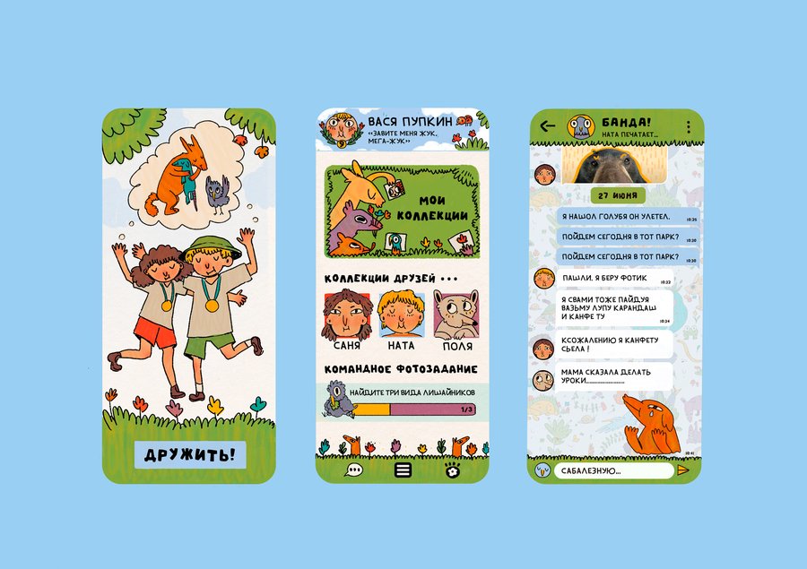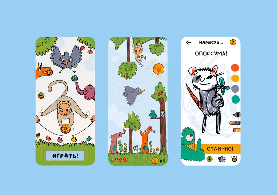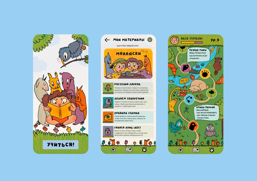 Приложение разделено на четыре раздела: игровой, социальный, образовательный и исследовательский, которые запускаются сразу при входе в приложение и переключаются пролистыванием.