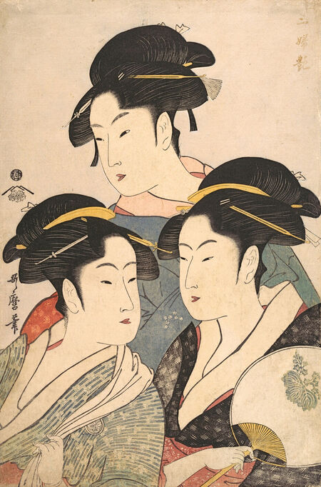Тосюсай Сяраку. Отани Онидзи III в роли слуги Эдобэя. 1794 // Китагава Утамаро. Три знаменитые красавицы. Ок. 1791.