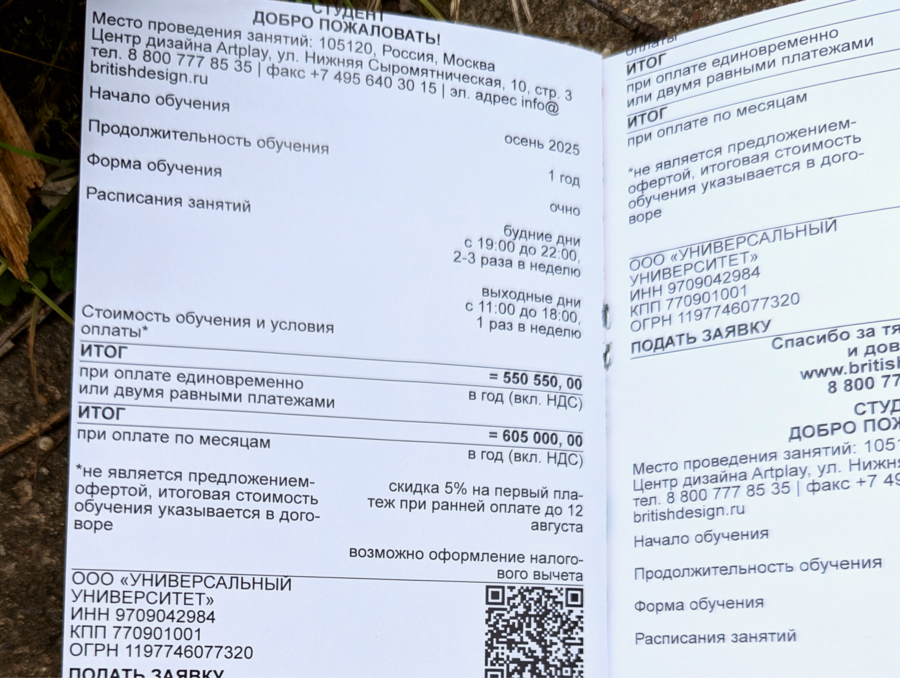 Основная информация об условиях обучения и ее оплаты в виде кассового чека, который специально немного обрезан сверху и снизу — как это часто бывает в магазинах (я изучила много чеков :)).