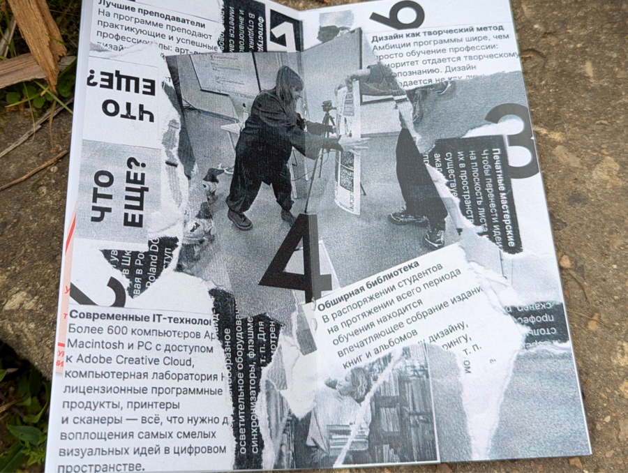 Ручной коллаж «В чем уникальность программы?» - лучшие преподаватели - дизайн как творческий метод - печатные мастерские - IT-технологии - обширная библиотека - фотостудии