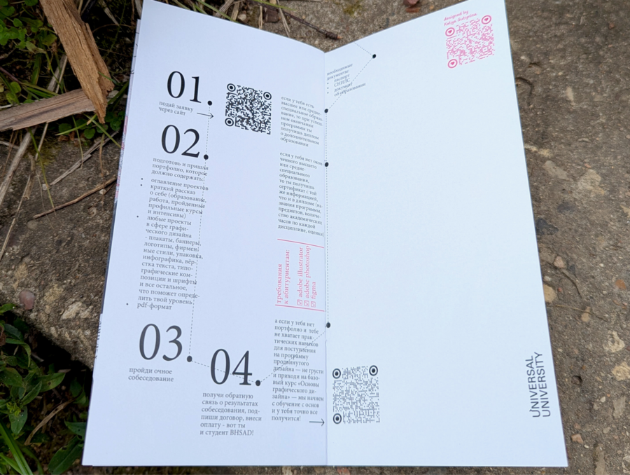 Верстка 16-ти страничного зина (брошюры) на тему обучения в Британской высшей школе дизайна на факультете Коммуникационного и digital-дизайна на программе ДПО «Графический дизайн. Продвинутый курс» в рамках модуля «Типографика».