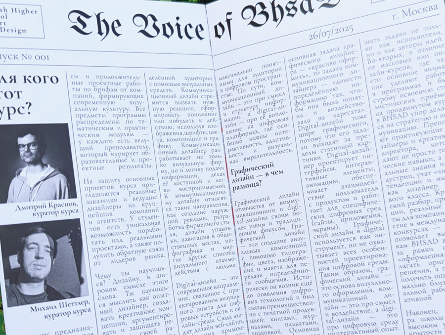 Второй разворот «Голос Британки» — верстка текста о курсе и его преимуществах в стиле старинной газеты от лица кураторов курса (большая часть текста сгенерирована искусственным интеллектом и не является мнением кураторов).