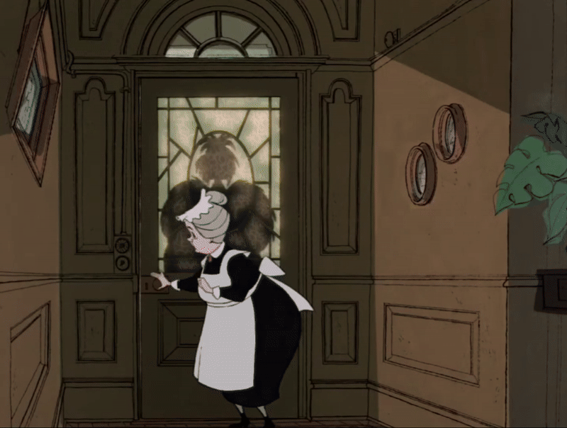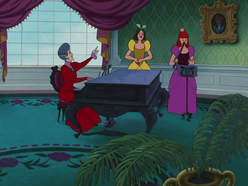 Далее следует сказать про выбор палитры в целом. Как и у Диснея, у других студий злодейки часто одеты в фиолетовый и синий, если больше обобщить, то в темные тона. Куки и Пати из «Ловушки для кошек» это хороший пример яркой палитры для более активных и говорливых персонажей и темной для холодных и молчаливых. Похожая ситуация случается в «Золушке», где Леди Тремейн носит преимущественно темную одежду, а Анастасия и Дризелла яркую.