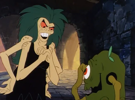 В период 1940-1980-х студии в большинстве своем в качестве антагонисток выбирают именно ведьм, и их явно больше, чем королев, как у Диснея. Они все при этом соблюдают типичный устоявшийся ведьминский образ: зеленая кожа, острая шляпа, зельеварение, горбатый нос, иногда с бородавкой и остроконечная шляпа. Все просто уходит в фольклор. На самом деле и у Диснея есть подобный прообраз в превращении Злой королевы. Она становится старухой с той самой с бородавкой на носу. От других ведьм ее отличает то, что она носит плащ с капюшоном, а не шляпу.